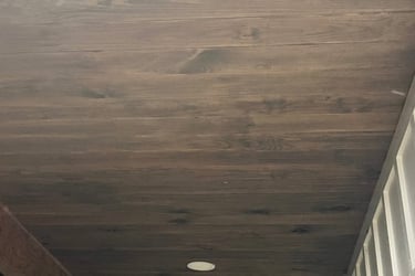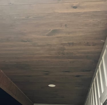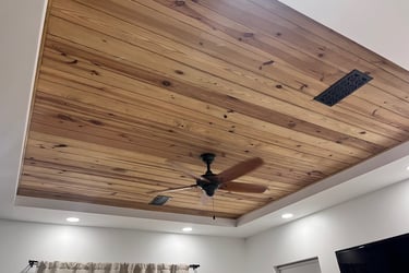 After we finished the tongue and groove on our porches, we decided to carry that look inside by adding the same detail to our living room ceiling—and it completely changed the feel of the space. The warm wood tones and texture gave the room such a cozy, inviting vibe, perfect for family hangouts or just relaxing. We loved it so much, we added it to the tray ceiling in our master bedroom too. It gave the room more character and a bit of elegance without feeling overdone. Now both the living room and our bedroom feel like warm, stylish retreats, and it really pulls everything together in the house.