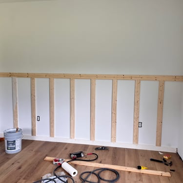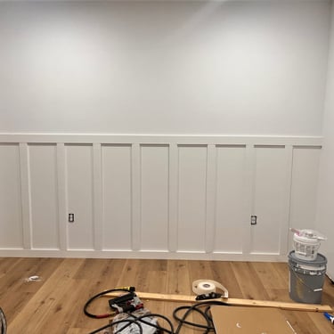 Once the flooring was finished, we transitioned smoothly to the trim work. We began by priming the trim to ensure a solid base, followed by painting it with Sherwin William semi gloss pure white for a clean and modern look. Once the trim was securely nailed in place, we meticulously filled any holes with DAP Plastic Wood putty to create a seamless appearance. After allowing the putty to dry, we sanded the areas for a smooth finish and touched up any spots with additional paint. The result was a polished and professional finish that perfectly complemented our new flooring.